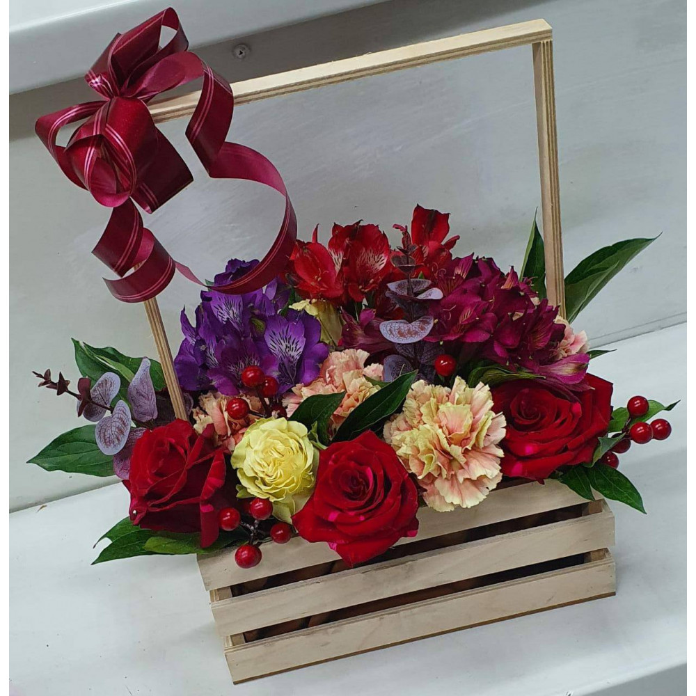 • Кофейно-бордовый букет роз и гвоздик в деревянном ящике