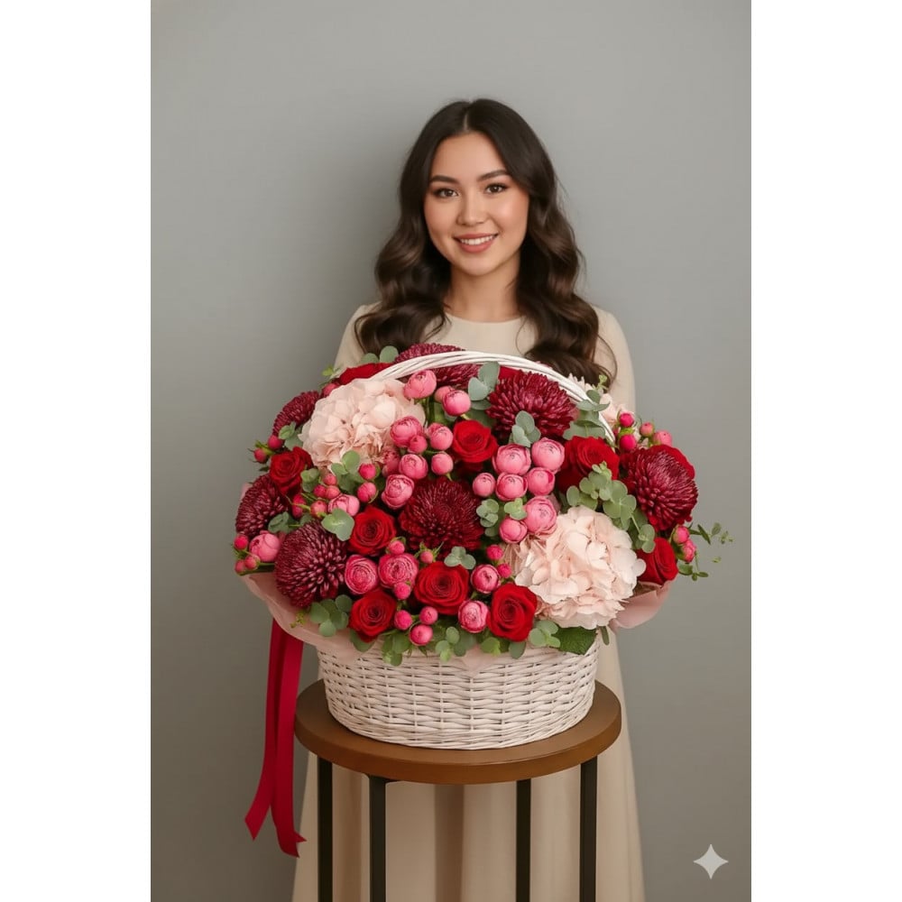 Корзина букета из хризантем, гортензий, роз, спрей роз и эвкалипта